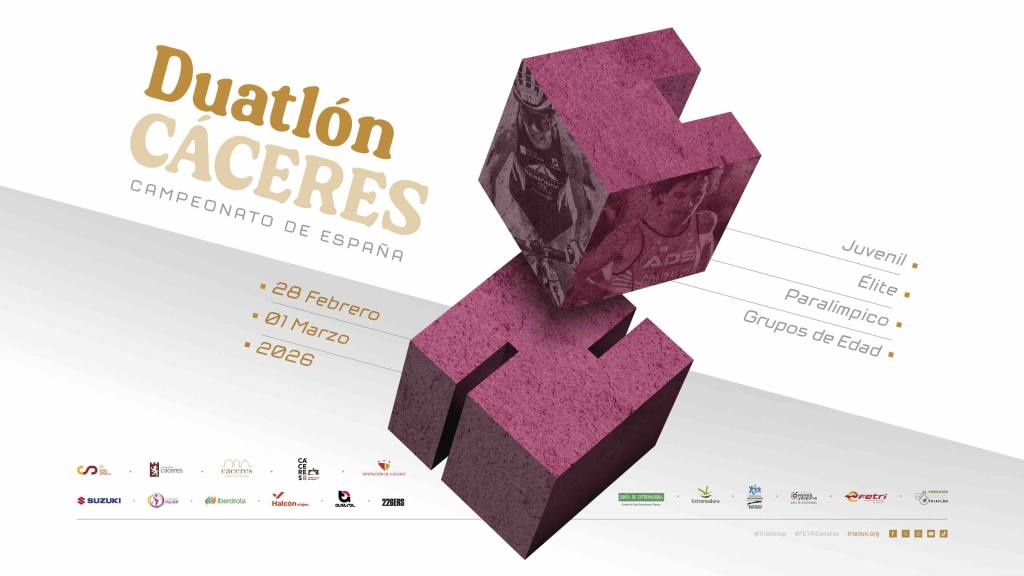 Cáceres recibirá los próximos 28 de febrero y 1 de marzo a casi mil deportistas para disputar las pruebas de los campeonatos de España de Duatlón y Duatlón Paralímpico 2026, antesala de la celebración en la ciudad del Campeonato de Europa de 2027. María Varo y Nacho Gálvez defenderán los títulos nacionales Élite en las carreras que se disputarán el sábado 28 por la tarde, emitidas en directo en TeleDeporte a través de RTVE Play. El Duatlón Paralímpico abrirá el programa de competiciones, y el domingo 1 de marzo queda reservado para las y los deportistas de Grupos de Edad y categoría Juvenil. Toda la información del Campeonato de España de Duatlón se puede consultar aquí. Información del Campeonato de España de Duatlón Paralímpico, aquí.